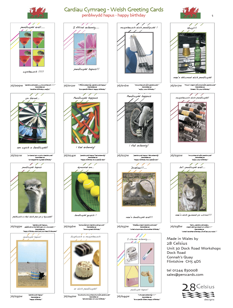 28 Celsius offer a fine selection of greeting cards with Welsh Language for many occasions including birthday, new baby, wedding, sympathy, anniversary, get well, good luck, thinking of you and retirement. We also can supply any of our designs with any caption to meet your individual requirements in small quantities.