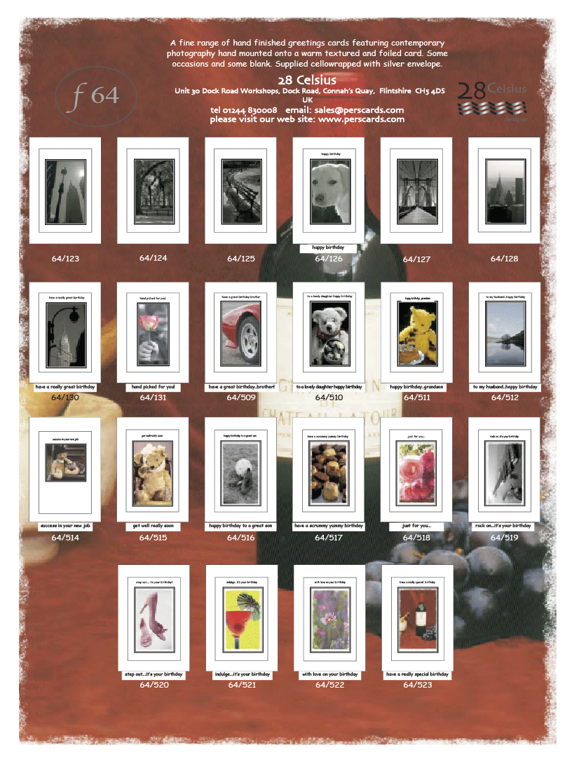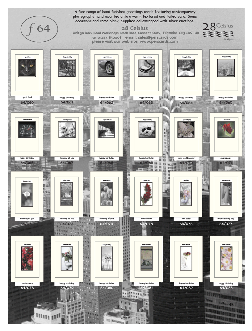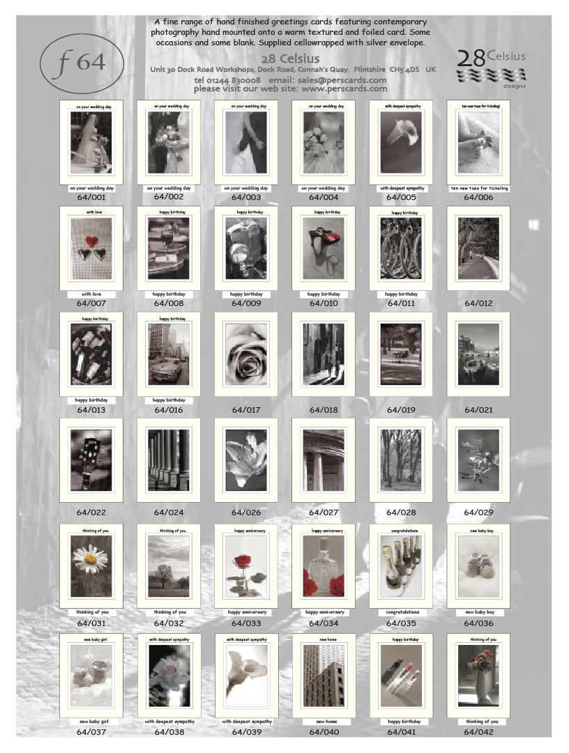 F64 is a fine range of hand finished greeting cards featuring contemporary photograph hand mounted onto a warm textured board. Many ocassions are covered. Supplied individually cellowrapped with envelope.